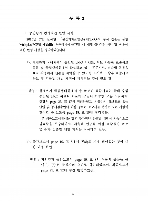 부 록 2 1. 중간평가 평가의견 반영 사항 2015년 7월 실시한 「유전자재조합생물체 LMO 의 동시 검출을 위한 Multiplex-PCR법 개발 III 」 연구과제의 중간평가에 대해 심사위원 제시 평가의견에 대한 반영 사항을 정리하였습니다. 가. 현재까지 국내외에서 승인된 LMO 이벤트, 확보 가능한 표준시료 목록 및 국립생태원에서 확보하고 있는 표준시료, 검출법 목록을 표로 작성해서 현황을 파악할 수 있도록 표시하고 향후 표준시료 확보 및 검출법 개발 계획이 제시되는 것이 필요 함. 반영 현재까지 국립생태원에서 총 확보된 표준시료는 국내 수입 승인된 LMO 이벤트 가운데 구입이 가능한 모든 시료이며, 현황은 page 33, 표 17에 정리하였고, 지금까지 확보하고 있는 단일 및 동시검출법에 대한 정보는...