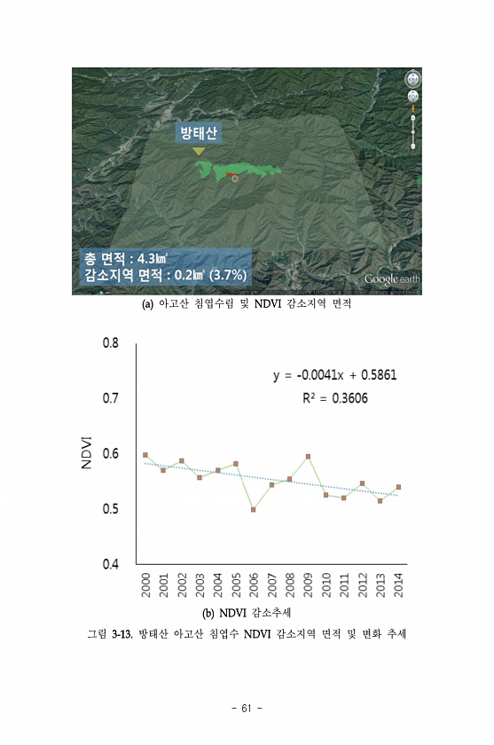61 아고산 침엽수림 및 감소지역 면적 감소추세 그림 방태산 아고산 침엽수 감소지역 면적 및 변화추세