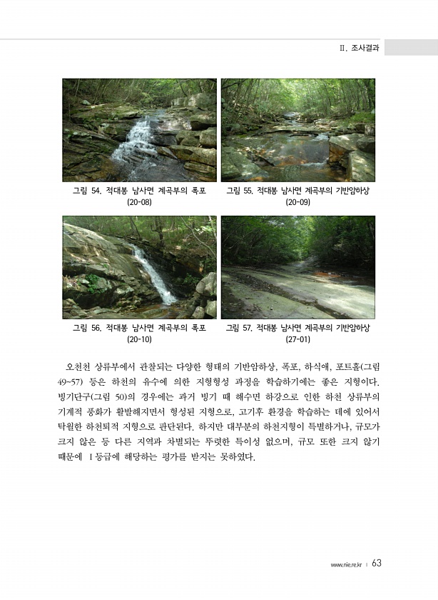 Ⅱ. 조사결과 www.nie.re.kr ? 63 그림 54. 적대봉 남사면 계곡부의 폭포 20-08 그림 55. 적대봉 남사면 계곡부의 기반암하상 20-09 그림 56. 적대봉 남사면 계곡부의 폭포 20-10 그림 57. 적대봉 남사면 계곡부의 기반암하상 27-01 오천천 상류부에서 관찰되는 다양한 형태의 기반암하상, 폭포, 하식애, 포트홀 그림 4957 등은 하천의 유수에 의한 지형형성 과정을 학습하기에는 좋은 지형이다. 빙기단구 그림 50 의 경우에는 과거 빙기 때 해수면 하강으로 인한 하천 상류부의 기계적 풍화가 활발해지면서 형성된 지형으로, 고기후 환경을 학습하는 데에 있어서 탁월한 하천퇴적 지형으로 판단된다. 하지만 대부분의 하천지형이 특별하거나, 규모가 크지 않은 등 다른 지역과 차별되는 뚜렷한 ...