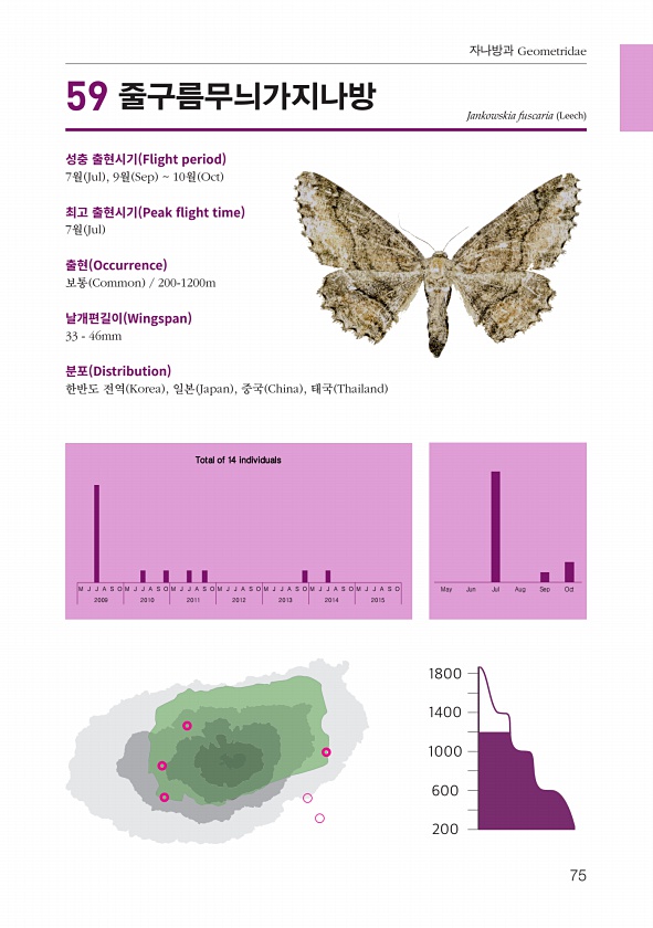 75 자나방과 Geometridae 성충 출현시기 Flight period 7월 Jul , 9월 Sep 10월 Oct 최고 출현시기 Peak fight time 7월 Jul 출현 Occurrence 보통 Common 200-1200m 날개편길이 Wingspan 33 46mm 분포 Distribution 한반도 전역 Korea , 일본 Japan , 중국 China , 태국 Thailand 59 줄구름무늬가지나방 Jankowskia fuscaria Leech M J J A S O M J J A S O M J J A S O M J J A S O M J J A S O M J J A S O M J J A S O May Jun Jul Aug Sep Oct 2009 2010 2011 2012 2013 2014 2015...