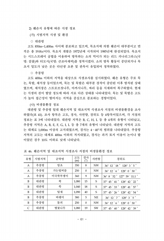 61 2 훼손지 유형에 따른 식생 정보 가 시범지역 식생 및 환경 ○ 대관령 고도 850m1,400m 사이에 분포하고 있으며, 목초지에 의한 훼손이 대부분이고 면 적은 총 19.8㎢이다. 목초지 개발은 1972년에 시작되어 1985년에 완성되었다. 목초지 는 시드스프레이 공법을 이용하여 방목하는 소의 먹이가 되는 리드 카나리그라스 국 명갈풀 와 티모시 국명큰조아재비 를 정착시켰다. 소의 방목 활동이 중단되거나 목 초지 밀도가 낮은 곳은 다년생 초본 및 관목이 유입되어 정착하였다. ○ 추풍령 고도 400m 이하의 지역을 대상으로 식생조사를 실시하였다. 훼손 유형은 주로 묵 논, 묵밭, 채석장 등이었으며, 묵논 및 묵밭은 대부분 경작이 중단된 이후 방치된 상태 였으며, 채석장은 스트로브잣나무, 아까시나무, 싸리...