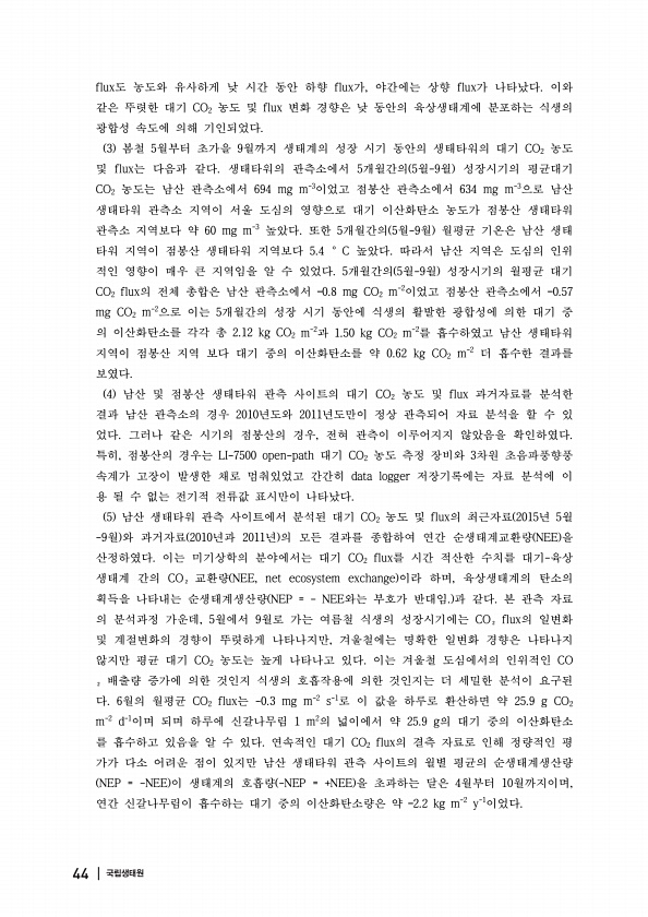 flux도 농도와 유사하게 낮 시간 동안 하향 flux가, 야간에는 상향 flux가 나타났다. 이와 같은 뚜렷한 대기 CO2 농도 및 flux 변화 경향은 낮 동안의 육상생태계에 분포하는 식생의 광합성 속도에 의해 기인되었다. 3 봄철 5월부터 초가을 9월까지 생태계의 성장 시기 동안의 생태타워의 대기 CO2 농도 및 flux는 다음과 같다. 생태타워의 관측소에서 5개월간의 5월-9월 성장시기의 평균대기 CO2 농도는 남산 관측소에서 694 mg m-3이었고 점봉산 관측소에서 634 mg m-3으로 남산 생태타워 관측소 지역이 서울 도심의 영향으로 대기 이산화탄소 농도가 점봉산 생태타워 관측소 지역보다 약 60 mg m-3 높았다. 또한 5개월간의 5월-9월 월평균 기온은 남산 생태 타워 지역이 점봉산 생태...
