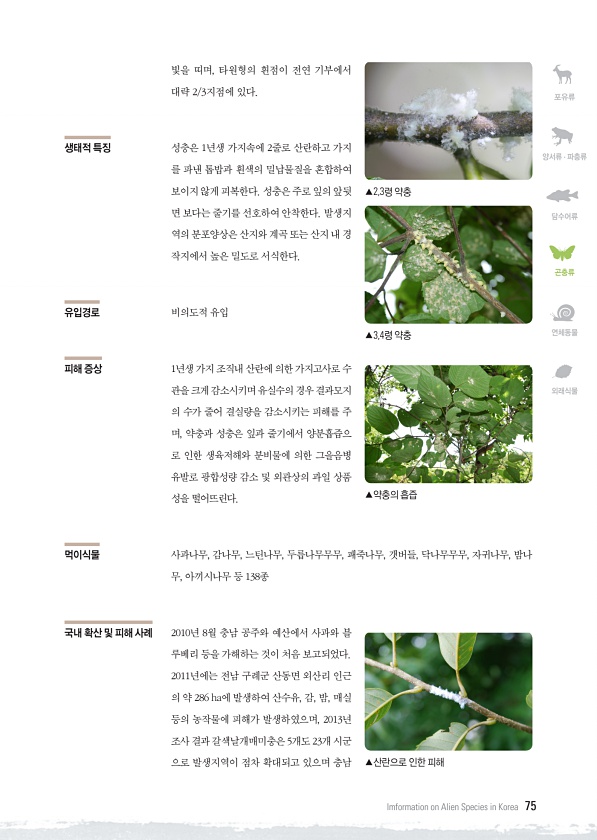 포유류 양서류 · 파충류 담수어류 곤충류 연체동물 외래식물 Imformation on Alien Species in Korea 75 빛을 띠며, 타원형의 흰점이 전연 기부에서 대략 2/3지점에 있다. 생태적 특징 성충은 1년생 가지속에 2줄로 산란하고 가지 를 파낸 톱밥과 흰색의 밀납물질을 혼합하여 보이지 않게 피복한다. 성충은 주로 잎의 앞뒷 면 보다는 줄기를 선호하여 안착한다. 발생지 역의 분포양상은 산지와 계곡 또는 산지 내 경 작지에서 높은 밀도로 서식한다. 유입경로 비의도적 유입 피해 증상 1년생 가지 조직내 산란에 의한 가지고사로 수 관을 크게 감소시키며 유실수의 경우 결과모지 의 수가 줄어 결실량을 감소시키는 피해를 주 며, 약충과 성충은 잎과 줄기에서 양분흡즙으 로 인한 생육저해와 분비물에 의...