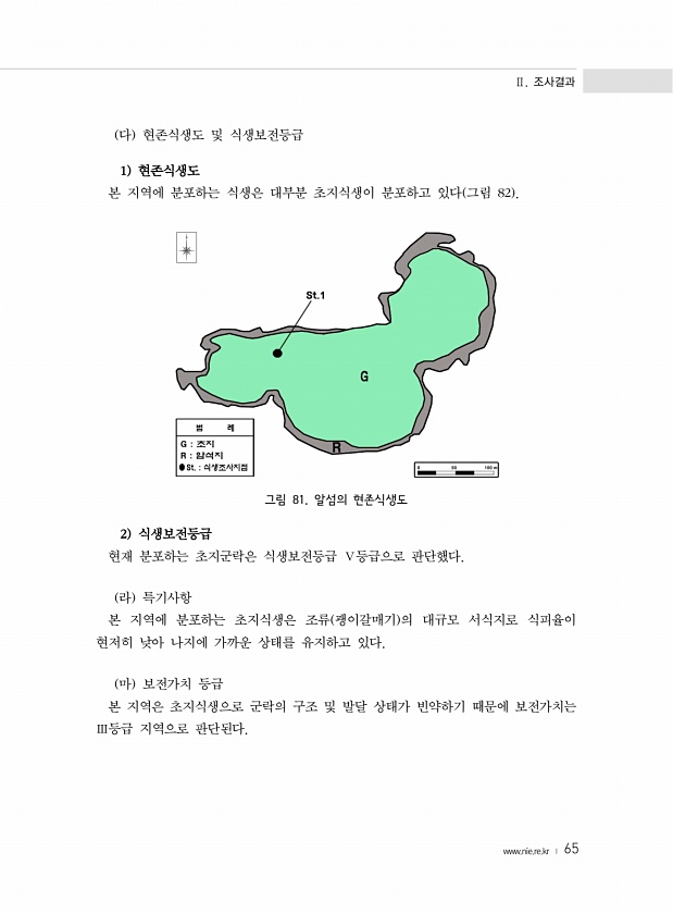 Ⅱ. 조사결과 www.nie.re.kr ? 65 다 현존식생도 및 식생보전등급 1 현존식생도 본 지역에 분포하는 식생은 대부분 초지식생이 분포하고 있다 그림 82 그림 81. 알섬의 현존식생도 2 식생보전등급 현재 분포하는 초지군락은 식생보전등급 Ⅴ등급으로 판단했다. 라 특기사항 본 지역에 분포하는 초지식생은 조류 괭이갈매기 의 대규모 서식지로 식피율이 현저히 낮아 나지에 가까운 상태를 유지하고 있다. 마 보전가치 등급 본 지역은 초지식생으로 군락의 구조 및 발달 상태가 빈약하기 때문에 보전가치는 Ⅲ등급 지역으로판단된다.