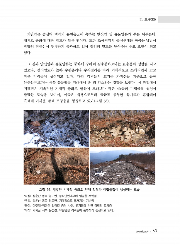 Ⅱ. 조사결과 www.nie.re.kr ? 63 기반암은 중생대 백악기 유천층군에 속하는 안산암 및 유문암류가 주를 이루는데, 대체로 풍화에 대한 강도가 높은 편이다. 또한 조사지역의 중심부에는 북북동-남남서 방향의 단층선이 뚜렷하게 통과하고 있어 절리의 밀도를 높여주는 주요 요인이 되고 있다. 그 결과 안산암과 유문암류는 풍화에 강하여 심층풍화보다는 표층풍화 성향을 띠고 있으나, 절리밀도가 높아 수평층리나 수직절리를 따라 기계적으로 쪼개지면서 크고 작은 각력들이 생성되고 있다. 다만 각력들의 크기는 가지산을 기준으로 동쪽 안산암류보다는 서쪽 유문암류 지대에서 좀 더 감소하는 경향을 보인다. 이 과정에서 지표면은 지속적인 기계적 풍화로 인하여 모래보다 작은 silt급의 미립물질 생성이 활발한 모습을 보이며,...
