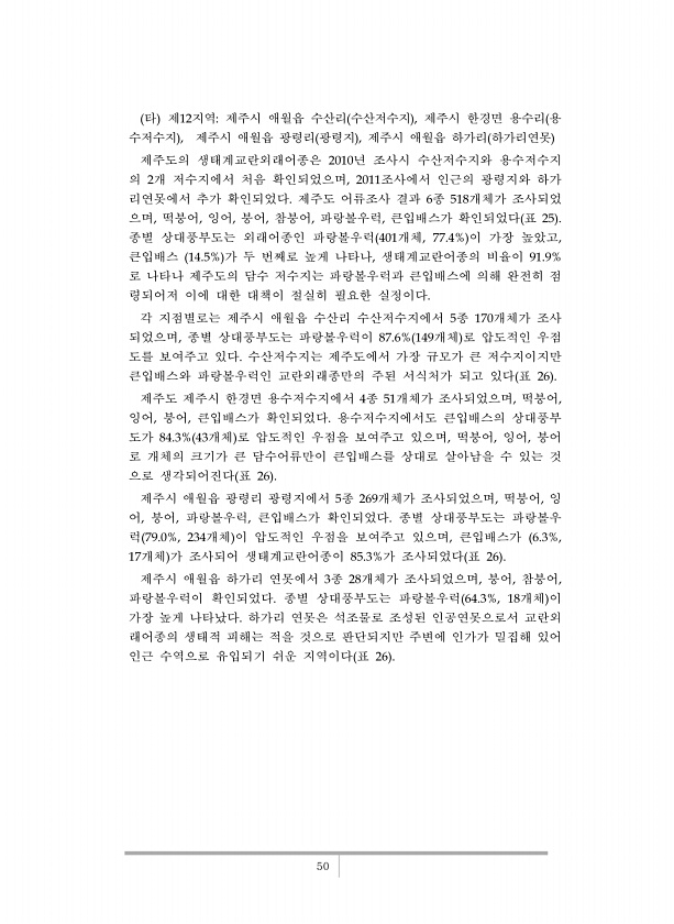 50 타 제12지역제주시 애월읍 수산리 수산저수지 , 제주시 한경면 용수리 용 수저수지 , 제주시 애월읍 광령리 광령지 , 제주시 애월읍 하가리 하가리연못 제주도의 생태계교란외래어종은 2010년 조사시 수산저수지와 용수저수지 의 2개 저수지에서 처음 확인되었으며, 2011조사에서 인근의 광령지와 하가 리연못에서 추가 확인되었다. 제주도 어류조사 결과 6종 518개체가 조사되었 으며, 떡붕어, 잉어, 붕어, 참붕어, 파랑볼우럭, 큰입배스가 확인되었다 표 25 종별 상대풍부도는 외래어종인 파랑볼우럭 401개체, 77.4% 이 가장 높았고, 큰입배스 14.5% 가 두 번째로 높게 나타나, 생태계교란어종의 비율이 91.9% 로 나타나 제주도의 담수 저수지는 파랑볼우럭과 큰입배스에 의해 완전히 점 령되어저 이에 대한...
