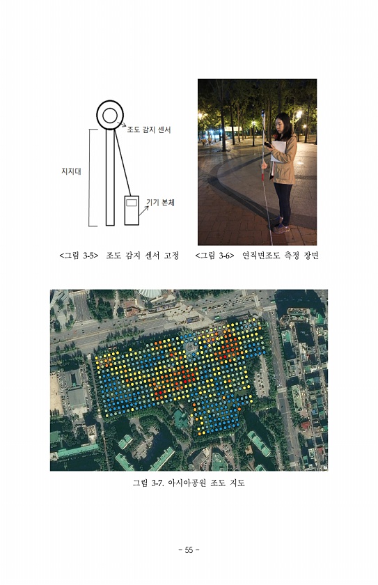 그림 3-5 조도 감지 센서 고정 그림 3-6 연직면조도 측정 장면 그림 3-7. 아시아공원 조도 지도 55