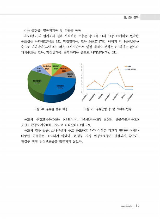 Ⅱ. 조사결과 www.nie.re.kr ? 65 나 출현종, 멸종위기종 및 희귀종 목록 옥도 왕도 의 현지조사 결과 서식하는 곤충은 총 7목 11과 11종 17개체로 빈약한 종조성을 나타내었다 표 13 딱정벌레목, 벌목 3종 27.27% , 나머지 각 1종 9.09% 순으로 나타났다 그림 20 짧은 조사시간으로 인한 개체수 분석은 큰 의미는 없으나 개체수로는 벌목, 딱정벌레목, 풀잠자리목 순으로 나타났다 그림 21 그림 20. 분류별 종수 비율. 그림 21. 분류군별 종 및 개체수 현황. 옥도의 우점도지수 DI 는 0.353이며, 다양도지수 H3.293, 종풍부도지수 RI 3.530, 균등도지수 EI 0.952로 나타났다 그림 22 옥도의 경우 곰솔, 소나무류가 주로 분포하고 하부 식생은 비교적 빈약한 상태...