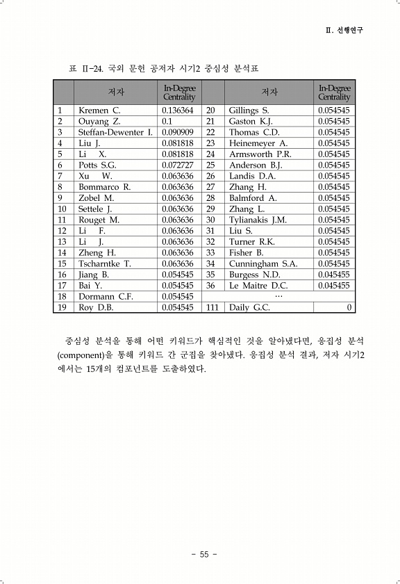Ⅱ. 선행연구 55 저자 Centrality In-Degree 저자 Centrality In-Degree 1 Kremen C. 0.136364 20 Gillings S. 0.054545 2 Ouyang Z. 0.1 21 Gaston K.J. 0.054545 3 Steffan-Dewenter I. 0.090909 22 Thomas C.D. 0.054545 4 Liu J. 0.081818 23 Heinemeyer A. 0.054545 5 Li X. 0.081818 24 Armsworth P.R. 0.054545 6 Potts S.G. 0.072727 25 Anderson B.J. 0.054545 7 Xu W. 0.063636 26 Landis D.A. 0.054545 8 Bommarco R. 0.063636 2...