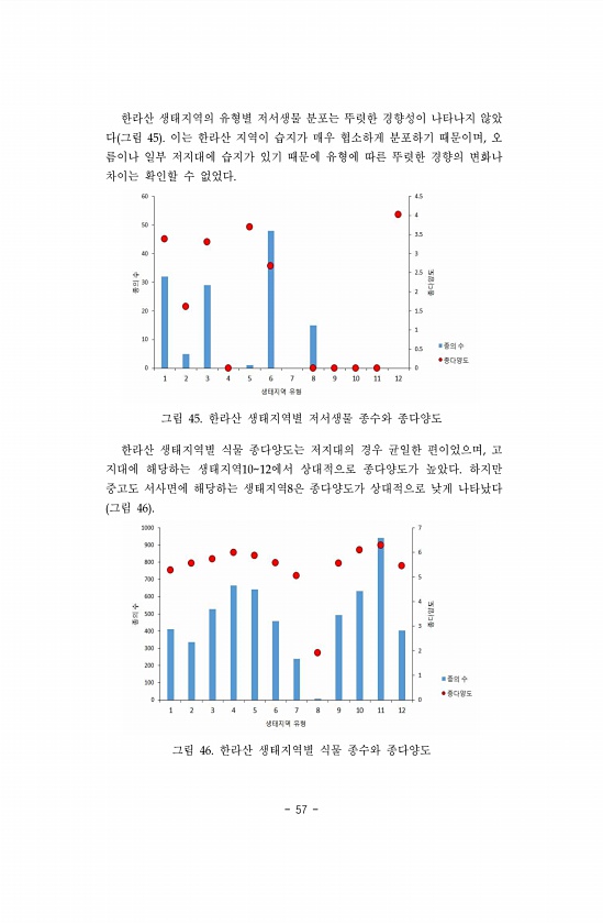 57 한라산 생태지역의 유형별 저서생물 분포는 뚜렷한 경향성이 나타나지 않았 다 그림 45 이는 한라산 지역이 습지가 매우 협소하게 분포하기 때문이며, 오 름이나 일부 저지대에 습지가 있기 때문에 유형에 따른 뚜렷한 경향의 변화나 차이는 확인할 수 없었다. 그림 45. 한라산 생태지역별 저서생물 종수와 종다양도 한라산 생태지역별 식물 종다양도는 저지대의 경우 균일한 편이었으며, 고 지대에 해당하는 생태지역1012에서 상대적으로 종다양도가 높았다. 하지만 중고도 서사면에 해당하는 생태지역8은 종다양도가 상대적으로 낮게 나타났다 그림 46 그림 46. 한라산 생태지역별 식물 종수와종다양도
