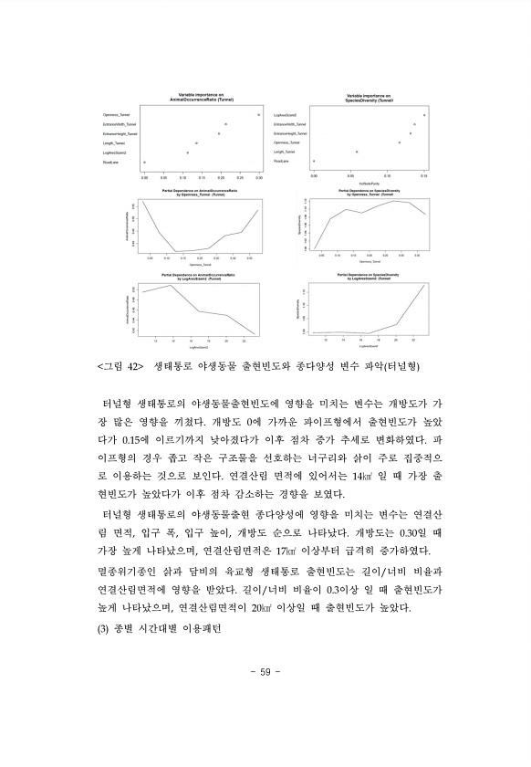 59 그림 42 생태통로 야생동물 출현빈도와 종다양성 변수 파악 터널형 터널형 생태통로의 야생동물출현빈도에 영향을 미치는 변수는 개방도가 가 장 많은 영향을 끼쳤다. 개방도 0에 가까운 파이프형에서 출현빈도가 높았 다가 0.15에 이르기까지 낮아졌다가 이후 점차 증가 추세로 변화하였다. 파 이프형의 경우 좁고 작은 구조물을 선호하는 너구리와 삵이 주로 집중적으 로 이용하는 것으로 보인다. 연결산림 면적에 있어서는 14㎢ 일 때 가장 출 현빈도가 높았다가 이후 점차 감소하는 경향을 보였다. 터널형 생태통로의 야생동물출현 종다양성에 영향을 미치는 변수는 연결산 림 면적, 입구 폭, 입구 높이, 개방도 순으로 나타났다. 개방도는 0.30일 때 가장 높게 나타났으며, 연결산림면적은 17㎢ 이상부터 급격히 증가하였다...
