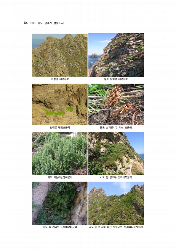 64 2015 독도 생태계 정밀조사 천장굴 해국군락 동도 암벽부 해국군락 천장굴 번행초군락 동도 섬괴불나무 하상 초종용 서도 가는갯능쟁이군락 서도 동 암벽부 갯제비쑥군락 서도 동 계곡부 도깨비고비군락 서도 정상 서쪽 능선 사철나무,보리밥나무자생지
