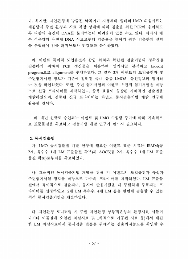 57 다. 하지만, 자연환경에 방출된 낙곡이나 자생체의 형태의 LMO 의심시료는 채집당시 주변 환경과 시료 저장 상태에 따라 검출을 위한 PCR에 용이하도 록 다량의 유전체 DNA를 분리하는데 어려움이 있을 수도 있다. 따라서 매 우 적은양의 유전체 DNA 시료로부터 검출율을 높이기 위한 검출한계 실험 을 수행하여 검출 최저농도와 민감도를 분석하였다. 마. 이벤트 특이적 도입유전자 삽입 위치와 확립된 검출기법의 정확성을 검증하기 위하여 PCR 생산물을 이용하여 염기서열 분석하고 bioedit program으로 alignment를 수행하였다. 그 결과 3개 이벤트의 도입유전자 및 주변염기서열 정보가 기존에 알려진 국내 유통 LMO의 유전정보와 일치하 는 것을 확인하였다. 또한, 주변 염기서열과 이벤트 유전체 ...