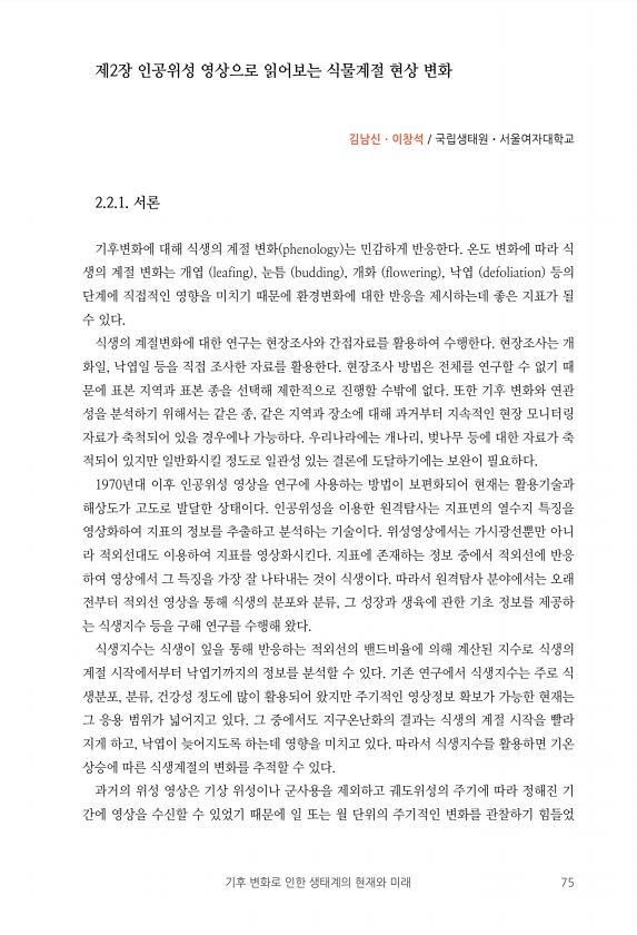 기후 변화로 인한 생태계의 현재와 미래 75 제2장 인공위성 영상으로 읽어보는 식물계절 현상 변화 김남신ㆍ이창석 국립생태원ㆍ서울여자대학교 2.2.1. 서론 기후변화에 대해 식생의 계절 변화 phenology 는 민감하게 반응한다. 온도 변화에 따라 식 생의 계절 변화는 개엽 leafing , 눈틈 budding , 개화 flowering , 낙엽 defoliation 등의 단계에 직접적인 영향을 미치기 때문에 환경변화에 대한 반응을 제시하는데 좋은 지표가 될 수 있다. 식생의 계절변화에 대한 연구는 현장조사와 간접자료를 활용하여 수행한다. 현장조사는 개 화일, 낙엽일 등을 직접 조사한 자료를 활용한다. 현장조사 방법은 전체를 연구할 수 없기 때 문에 표본 지역과 표본 종을 선택해 제한적으로 진행할 수밖에 없...