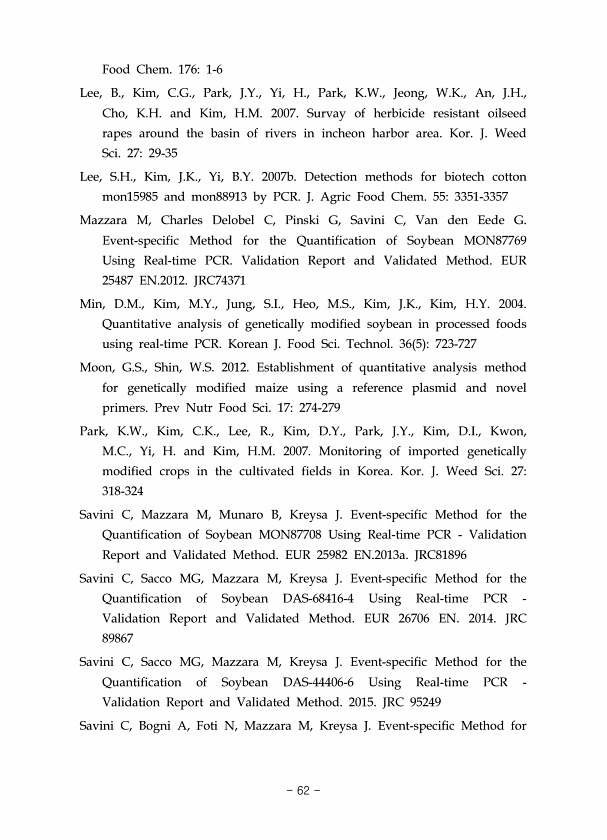 Food Chem. 1761-6 Lee, B., Kim, C.G., Park, J.Y., Yi, H., Park, K.W., Jeong, W.K., An, J.H., Cho, K.H. and Kim, H.M. 2007. Survay of herbicide resistant oilseed rapes around the basin of rivers in incheon harbor area. Kor. J. Weed Sci. 2729-35 Lee, S.H., Kim, J.K., Yi, B.Y. 2007b. Detection methods for biotech cotton mon15985 and mon88913 by PCR. J. Agric Food Chem. 553351-3357 Mazzara M, Charles ...