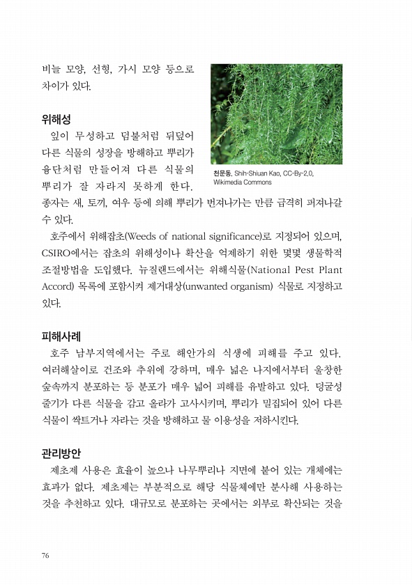 76 비늘 모양, 선형, 가시 모양 등으로 차이가 있다. 위해성 잎이 무성하고 덤불처럼 뒤덮어 다른 식물의 성장을 방해하고 뿌리가 융단처럼 만 들어져 다른 식물의 뿌리가 잘 자라지 못하게 한다. 종자는 새, 토끼, 여우 등에 의해 뿌리가 번져나가는 만큼 급격히 퍼져나갈 수 있다. 호주에서 위해잡초 Weeds of national significance 로 지정되어 있으며, CSIRO에서는 잡초의 위해성이나 확산을 억제하기 위한 몇몇 생물학적 조절방법을 도입했다. 뉴질랜드에서는 위해식물 National Pest Plant Accord 목록에 포함시켜 제거대상 unwanted organism 식물로 지정하고 있다. 피해사례 호주 남부지역에서는 주로 해안가의 식생에 피해를 주고 있다. 여러해살이로 건조와 추위에 ...
