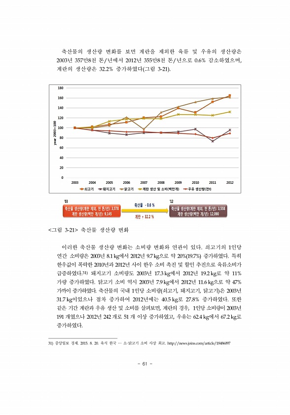 61 축산물의 생산량 변화를 보면 계란을 제외한 육류 및 우유의 생산량은 2003년 357만8천 톤/년에서 2012년 355만8천 톤/년으로 0.6% 감소하였으며, 계란의 생산량은 32.2% 증가하였다 그림 3-21 그림 3-21 축산물 생산량 변화 이러한 축산물 생산량 변화는 소비량 변화와 연관이 있다. 쇠고기의 1인당 연간 소비량은 2003년 8.1 kg에서 2012년 9.7 kg으로 약 20% 19.7% 증가하였다. 특히 한우값이 폭락한 2010년과 2012년 사이 한우 소비 촉진 및 할인 추진으로 육류소비가 급증하였다.31 돼지고기 소비량도 2003년 17.3 kg에서 2012년 19.2 kg로 약 11% 가량 증가하였다. 닭고기 소비 역시 2003년 7.9 kg에서 2012년 11.6 kg으로 약 ...