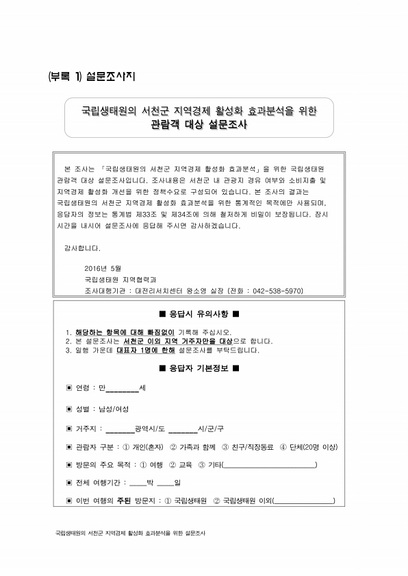 국립생태원의 서천군 지역경제 활성화 효과분석을 위한 설문조사 부록 1 설문조사지 국립생태원의 국립생태원의 서천군 서천군 지역경제 지역경제 활성화 활성화 효과분석을 효과분석을 위한 위한 관람객 관람객 대상 대상 설문조사 설문조사 본 조사는 「국립생태원의 서천군 지역경제 활성화 효과분석」을 위한 국립생태원 관람객 대상 설문조사입니다. 조사내용은 서천군 내 관광지 경유 여부와 소비지출 및 지역경제 활성화 개선을 위한 정책수요로 구성되어 있습니다. 본 조사의 결과는 국립생태원의 서천군 지역경제 활성화 효과분석을 위한 통계적인 목적에만 사용되며, 응답자의 정보는 통계법 제33조 및 제34조에 의해 철저하게 비밀이 보장됩니다. 잠시 시간을 내시어 설문조사에 응답해 주시면 감사하겠습니다. 감사합니다. 2016년 5월 국...