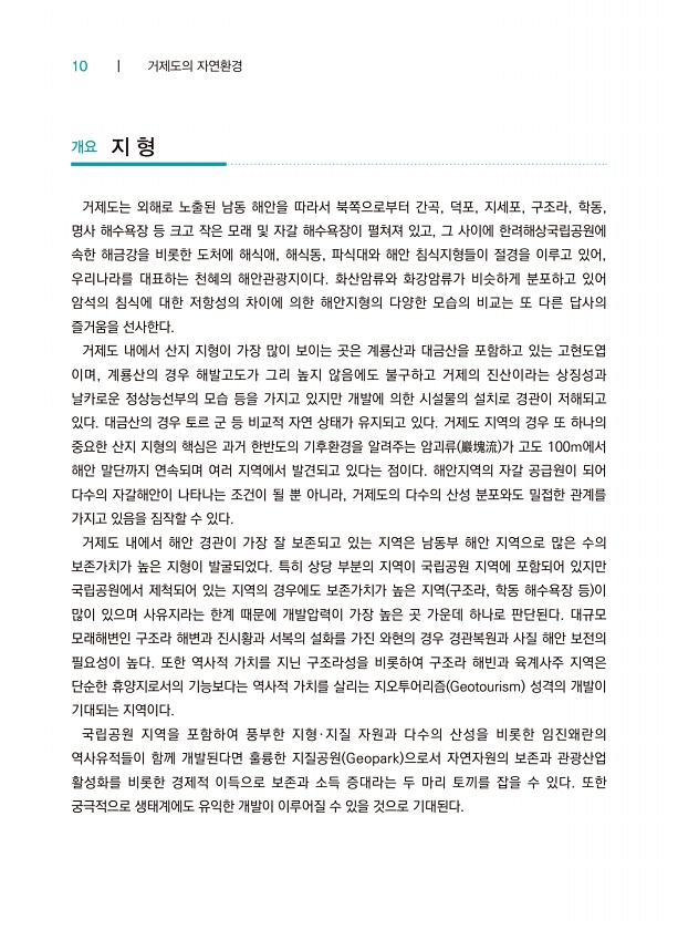 10 ┃ 거제도의 자연환경 개요 지 형 거제도는 외해로 노출된 남동 해안을 따라서 북쪽으로부터 간곡, 덕포, 지세포, 구조라, 학동, 명사 해수욕장 등 크고 작은 모래 및 자갈 해수욕장이 펼쳐져 있고, 그 사이에 한려해상국립공원에 속한 해금강을 비롯한 도처에 해식애, 해식동, 파식대와 해안 침식지형들이 절경을 이루고 있어, 우리나라를 대표하는 천혜의 해안관광지이다. 화산암류와 화강암류가 비슷하게 분포하고 있어 암석의 침식에 대한 저항성의 차이에 의한 해안지형의 다양한 모습의 비교는 또 다른 답사의 즐거움을 선사한다. 거제도 내에서 산지 지형이 가장 많이 보이는 곳은 계룡산과 대금산을 포함하고 있는 고현도엽 이며, 계룡산의 경우 해발고도가 그리 높지 않음에도 불구하고 거제의 진산이라는 상징성과 날카로운 정상능...