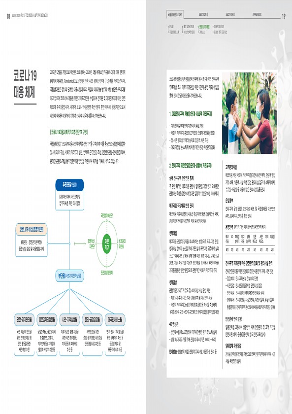 18 2018-2020 제2차 국립생태원 사회적가치경영보고서 국립생태원 STORY SECTIONⅠ SECTIONⅡ APPENDIX 19 코로나19 대응 체계 2019년 12월을 기점으로 확산된 코로나19는 2020년 3월 세계보건기구 WHO 에 의해 펜데믹 세계적 대유행, Pandemic 으로 선언된 만큼 사회?경제 전반에 큰 충격을 가져왔습니다. 국립생태원은 정부의 단계별 대응사황에 따라 지침의 이해가능 범위와 예방 방안을 모니터링 하고 있으며 코로나19 대응을 위한 가이드라인을 수립하여 전직원 및 이해관계자에 대한 안전 확보에 주력 중입니다. 나아가 코로나19 감염병 확산 방지 뿐만 아니라 공공기관으로서 사회적 책임을 이행하기 위하여 전사적 대응체계를 마련하였습니다. 국립생태원은 ‘코로나19대응사회적가치...