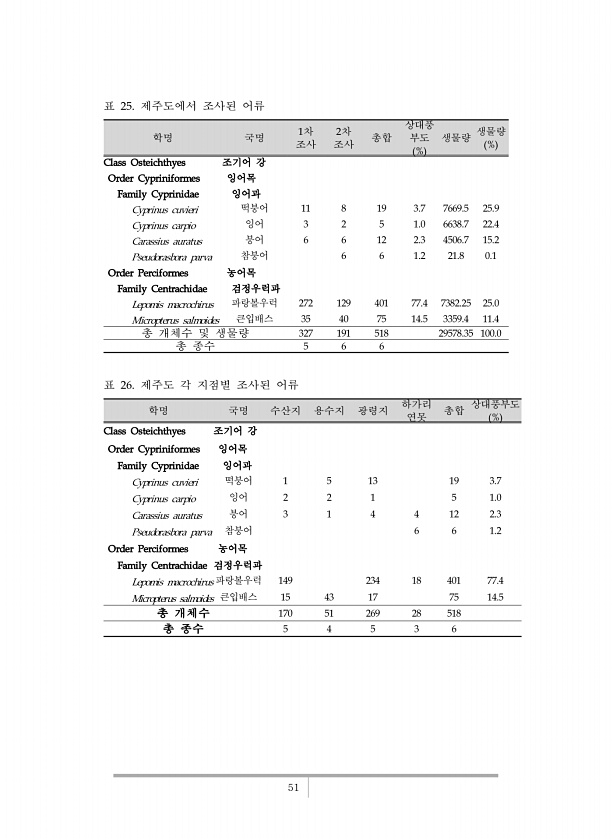 51 학명 국명 1차 조사 2차 조사 총합 상대풍 부도 % 생물량 생물량 % Class Osteichthyes 조기어 강 Order Cypriniformes 잉어목 Family Cyprinidae 잉어과 Cyprinus cuvieri 떡붕어 11 8 19 3.7 7669.5 25.9 Cyprinus carpio 잉어 3 2 5 1.0 6638.7 22.4 Carassius auratus 붕어 6 6 12 2.3 4506.7 15.2 Pseudorasbora parva 참붕어 6 6 1.2 21.8 0.1 Order Perciformes 농어목 Family Centrachidae 검정우럭과 Lepomis macrochirus 파랑볼우럭 272 129 401 77.4 7382.25 25.0 Micropterus...