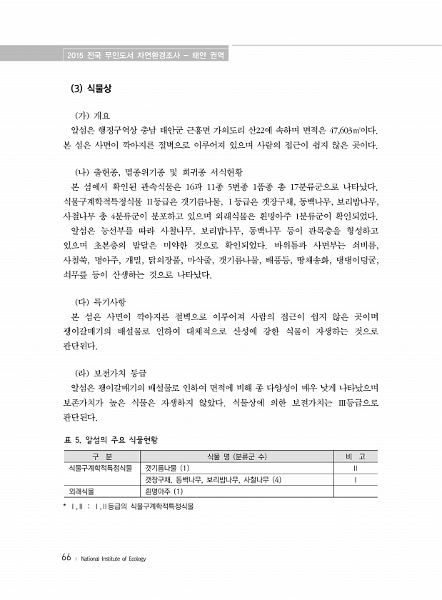 2015 전국 무인도서 자연환경조사 태안 권역 66 ? National Institute of Ecology 3 식물상 가 개요 알섬은 행정구역상 충남 태안군 근흥면 가의도리 산22에 속하며 면적은 47,603㎡이다. 본 섬은 사면이 깍아지른 절벽으로 이루어져 있으며 사람의 접근이 쉽지 않은 곳이다. 나 출현종, 멸종위기종 및 희귀종 서식현황 본 섬에서 확인된 관속식물은 16과 11종 5변종 1품종 총 17분류군으로 나타났다. 식물구계학적특정식물 Ⅱ등급은 갯기름나물, Ⅰ등급은 갯장구채, 동백나무, 보리밥나무, 사철나무 총 4분류군이 분포하고 있으며 외래식물은 흰명아주 1분류군이 확인되었다. 알섬은 능선부를 따라 사철나무, 보리밥나무, 동백나무 등이 관목층을 형성하고 있으며 초본층의 발달은 미약한 것으로 확인...