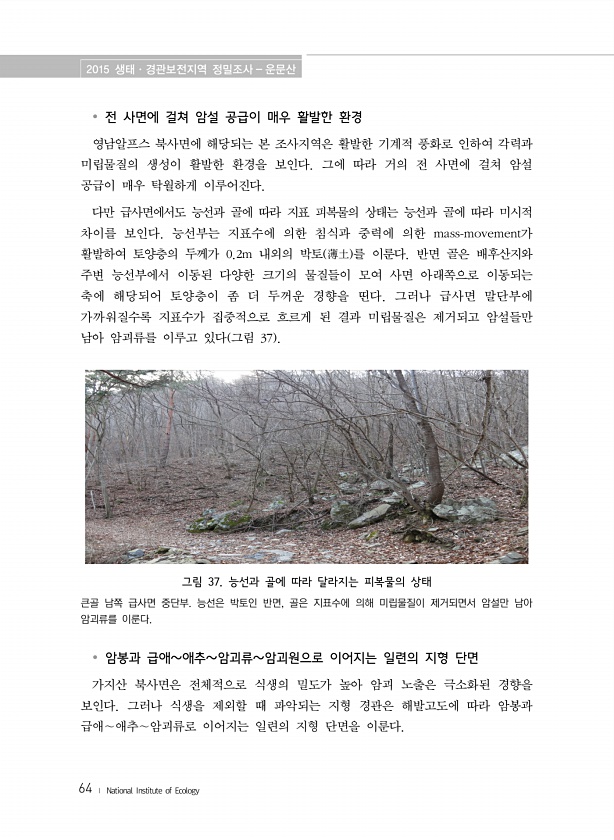 2015 생태·경관보전지역 정밀조사 운문산 64 ? National Institute of Ecology 전 사면에 걸쳐 암설 공급이 매우 활발한 환경 영남알프스 북사면에 해당되는 본 조사지역은 활발한 기계적 풍화로 인하여 각력과 미립물질의 생성이 활발한 환경을 보인다. 그에 따라 거의 전 사면에 걸쳐 암설 공급이 매우 탁월하게 이루어진다. 다만 급사면에서도 능선과 골에 따라 지표 피복물의 상태는 능선과 골에 따라 미시적 차이를 보인다. 능선부는 지표수에 의한 침식과 중력에 의한 mass-movement가 활발하여 토양층의 두께가 0.2m 내외의 박토 薄土 를 이룬다. 반면 골은 배후산지와 주변 능선부에서 이동된 다양한 크기의 물질들이 모여 사면 아래쪽으로 이동되는 축에 해당되어 토양층이 좀 더 두꺼운 경향...
