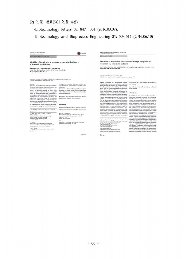 2 논문 발표 SCI 논문 4건 -Biotechnology letters 38847?854 2016.03.07 , -Biotechnology and Bioprocess Engineering 21508-514 2016.06.10