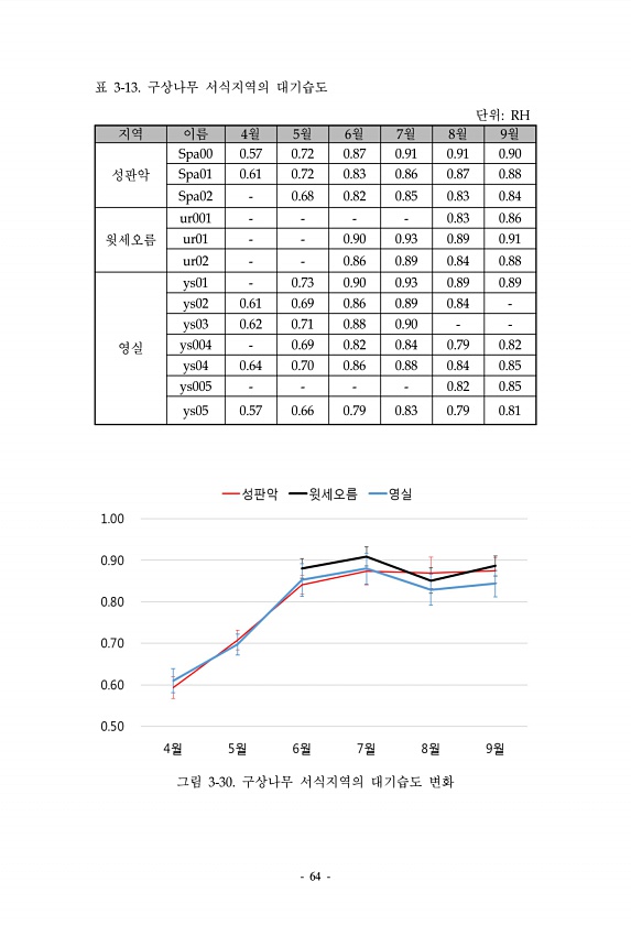 64 단위RH 지역 이름 4월 5월 6월 7월 8월 9월 성판악 Spa00 0.57 0.72 0.87 0.91 0.91 0.90 Spa01 0.61 0.72 0.83 0.86 0.87 0.88 Spa02 0.68 0.82 0.85 0.83 0.84 윗세오름 ur001 0.83 0.86 ur01 0.90 0.93 0.89 0.91 ur02 0.86 0.89 0.84 0.88 영실 ys01 0.73 0.90 0.93 0.89 0.89 ys02 0.61 0.69 0.86 0.89 0.84 ys03 0.62 0.71 0.88 0.90 ys004 0.69 0.82 0.84 0.79 0.82 ys04 0.64 0.70 0.86 0.88 0.84 0.85 ys005 0.82 0.85 ys05 0.57 0.66 0.79 ...
