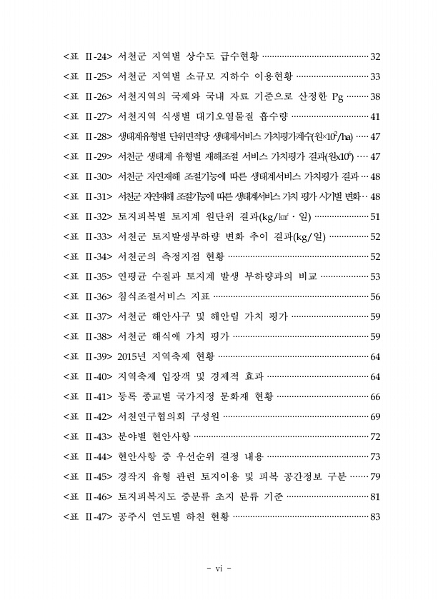 vi 표 서천군 지역별 상수도 급수현황 표 서천군 지역별 소규모 지하수 이용현황 표 서천지역의 국제와 국내 자료 기준으로 산정한 표 서천지역 식생별 대기오염물질 흡수량 표 생태계유형별 단위면적당 생태계서비스 가치평가계수원 표 서천군 생태계 유형별 재해조절 서비스 가치평가 결과 원 표 서천군 자연재해 조절기능에 따른 생태계서비스 가치평가 결과 표 서천군자연재해조절기능에따른생태계서비스가치평가시기별변화 표 토지피복별 토지계 원단위 결과 일 표 서천군 토지발생부하량 변화 추이 결과 일 표 서천군의 측정지점 현황 표 연평균 수질과 토지계 발생 부하량과의 비교 표 침식조절서비스 지표 표 서천군 해안사구 및 해안림 가치 평가 표 서천군 해식애 가치 평가 표 년 지역축제 현황 표 지역축제 입장객 및 경제적 효과 표 등록 ...