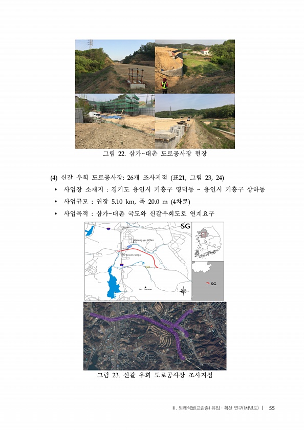 그림 삼가 대촌 도로공사장 현장 신갈 우회 도로공사장 개 조사지점 표 그림 ? 사업장 소재지 경기도 용인시 기흥구 영덕동 용인시 기흥구 상하동 ? 사업규모 연장 폭 차로 ? 사업목적 삼가 대촌 국도와 신갈우회도로 연계요구 그림 신갈 우회 도로공사장 조사지점 Ⅲ. 외래식물 교란종 유입·확산 연구 1차년도 |55