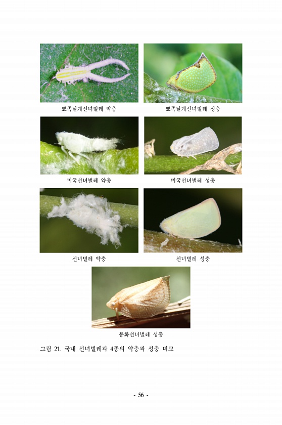 56 뾰족날개선녀벌레 약충 뾰족날개선녀벌레 성충 미국선녀벌레 약충 미국선녀벌레 성충 선녀벌레 약충 선녀벌레 성충 봉화선녀벌레 성충 그림 21. 국내 선녀벌레과 4종의 약충과 성충비교
