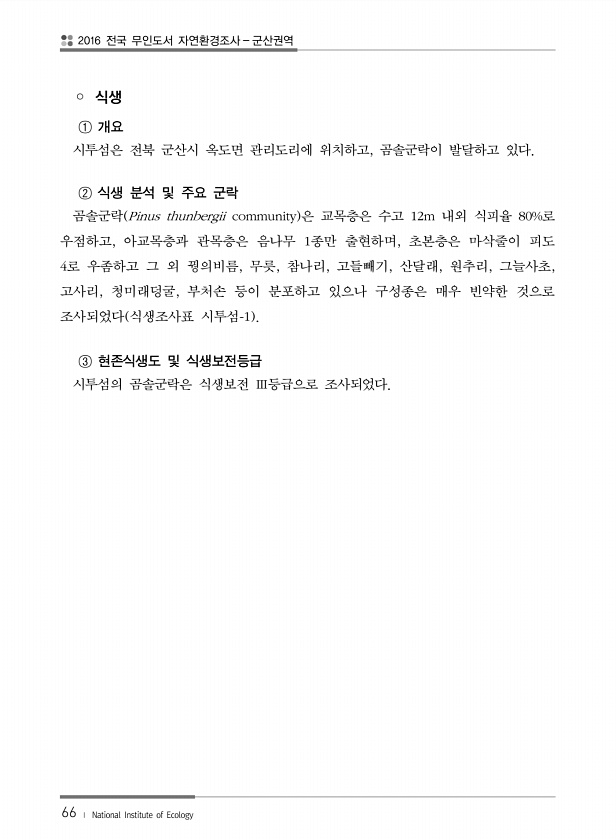 2016 전국 무인도서 자연환경조사 군산권역 66 ? National Institute of Ecology ? 식생 ① 개요 시투섬은 전북 군산시 옥도면 관리도리에 위치하고, 곰솔군락이 발달하고 있다. ② 식생 분석 및 주요 군락 곰솔군락 Pinus thunbergii community 은 교목층은 수고 12m 내외 식피율 80%로 우점하고, 아교목층과 관목층은 음나무 1종만 출현하며, 초본층은 마삭줄이 피도 4로 우좀하고 그 외 꿩의비름, 무릇, 참나리, 고들빼기, 산달래, 원추리, 그늘사초, 고사리, 청미래덩굴, 부처손 등이 분포하고 있으나 구성종은 매우 빈약한 것으로 조사되었다 식생조사표 시투섬-1 ③ 현존식생도 및 식생보전등급 시투섬의 곰솔군락은 식생보전 Ⅲ등급으로조사되었다.