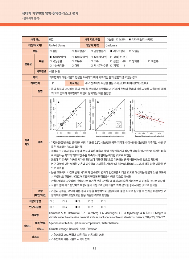 72 생태계 기후변화 영향·취약성·리스크 평가 -연구사례 분석- 사례 No. 052 사례 자료 유형 □논문 □ 보고서 ■ 기타 학술/기사자료 대상지 국가 United States 대상지 지역 California 부문 □ 통합 □ 취약성평가 □ 영향성평가 ■ 리스크평가 □ 모델링 분류군 부문 ■ 식물 활엽수 □ 식물 침엽수 □ 식물 활엽수 □ 식물 초 본 □ 육상동물 □ 포유류 □ 조류 □ 곤충 류 □ 양서류 □ 파충류 □ 수상동식물 □ 어류 □ 저서무척추류 □ 기타 세부정보 식물 64종 목적 기후변화에 대한 식물의 반응을 이해하기 위해 기후적인 물의 균형의 중요성을 강조 기후인자 T, P 자료기간 주요 산맥에서 수집한 설문 조사 plot의 데이터 1930-2005 사례 개요 방법 종의 최적의 고도에서 종의 ...