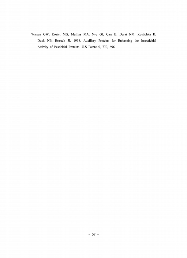 57 Warren GW, Koziel MG, Mullins MA, Nye GJ, Carr B, Desai NM, Kostichka K, Duck NB, Estruch JJ. 1998. Auxiliary Proteins for Enhancing the Insecticidal Activity of Pesticidal Proteins. U.S Patent 5, 770,696.