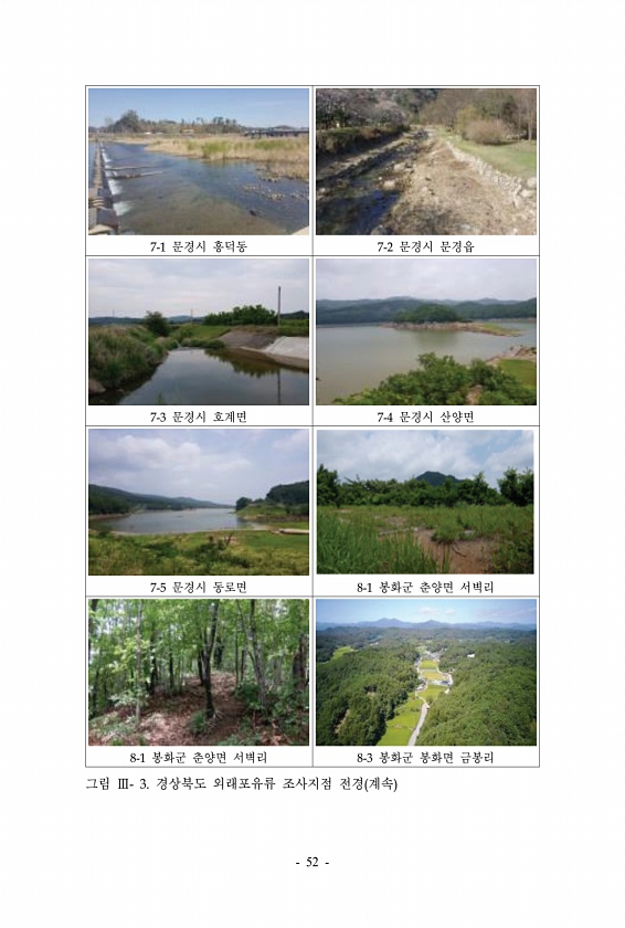 7-1 문경시 흥덕동 7-2 문경시 문경읍 7-3 문경시 호계면 7-4 문경시 산양면 7-5 문경시 동로면 8-1 봉화군 춘양면 서벽리 8-1 봉화군 춘양면 서벽리 8-3 봉화군 봉화면 금봉리 그림 Ⅲ- 3. 경상북도 외래포유류 조사지점 전경 계속 52