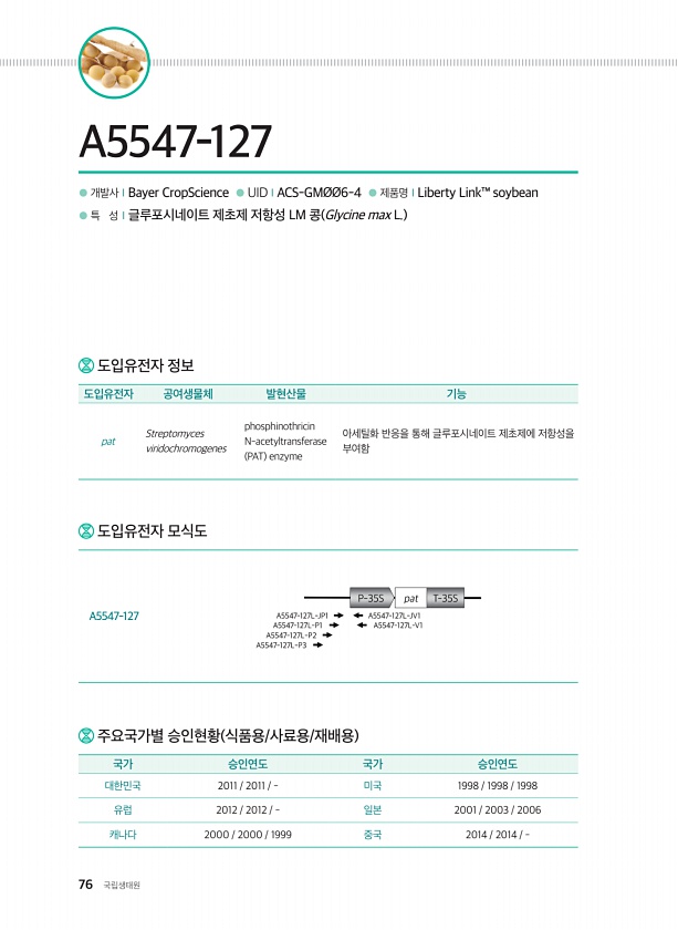 76 국립생태원 ● 개발사ⅠBayer CropScience ● UIDⅠACS-GMØØ6-4 ● 제품명ⅠLiberty Link™ soybean ● 특 성Ⅰ글루포시네이트 제초제 저항성 LM 콩 Glycine max L. A5547-127 주요국가별 승인현황 식품용/사료용/재배용 국가 승인연도 국가 승인연도 대한민국 2011 2011 미국 1998 1998 1998 유럽 2012 2012 일본 2001 2003 2006 캐나다 2000 2000 1999 중국 2014 2014 도입유전자 정보 도입유전자 공여생물체 발현산물 기능 pat Streptomyces viridochromogenes phosphinothricin N-acetyltransferase PAT enzyme 아세틸화 반응을 통해 글루포시네이트 제초...
