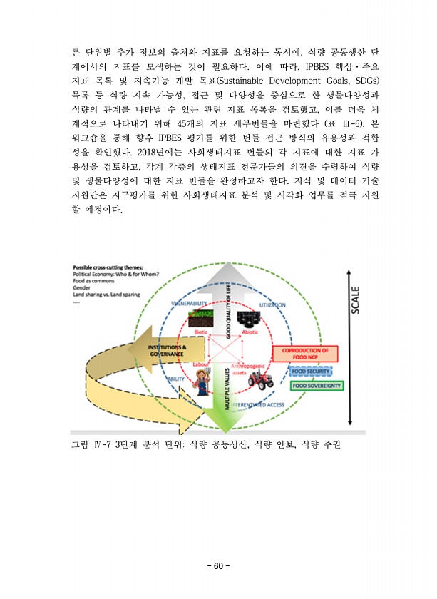 60 른 단위별 추가 정보의 출처와 지표를 요청하는 동시에, 식량 공동생산 단 계에서의 지표를 모색하는 것이 필요하다. 이에 따라, IPBES 핵심·주요 지표 목록 및 지속가능 개발 목표 Sustainable Development Goals, SDGs 목록 등 식량 지속 가능성, 접근 및 다양성을 중심으로 한 생물다양성과 식량의 관계를 나타낼 수 있는 관련 지표 목록을 검토했고, 이를 더욱 체 계적으로 나타내기 위해 45개의 지표 세부번들을 마련했다 표 Ⅲ-6 본 워크숍을 통해 향후 IPBES 평가를 위한 번들 접근 방식의 유용성과 적합 성을 확인했다. 2018년에는 사회생태지표 번들의 각 지표에 대한 지표 가 용성을 검토하고, 각계 각층의 생태지표 전문가들의 의견을 수렴하여 식량 및 생물다양성에 대한 지표...