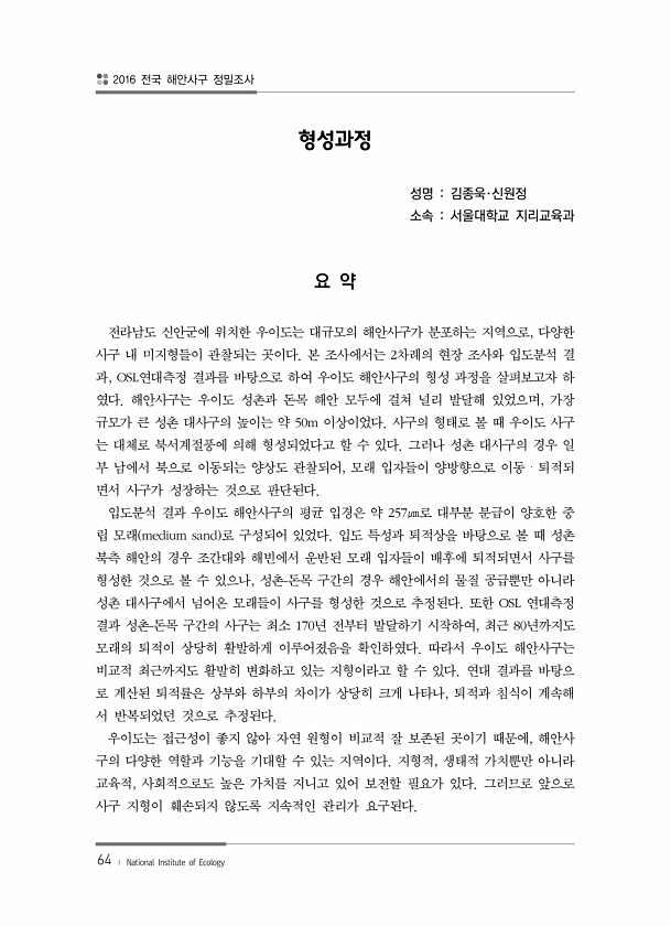 2016 전국 해안사구 정밀조사 64 ? National Institute of Ecology 형성과정 성명 김종욱·신원정 소속 서울대학교 지리교육과 요 약 전라남도 신안군에 위치한 우이도는 대규모의 해안사구가 분포하는 지역으로, 다양한 사구 내 미지형들이 관찰되는 곳이다. 본 조사에서는 2차례의 현장 조사와 입도분석 결 과, OSL연대측정 결과를 바탕으로 하여 우이도 해안사구의 형성 과정을 살펴보고자 하 였다. 해안사구는 우이도 성촌과 돈목 해안 모두에 걸쳐 널리 발달해 있었으며, 가장 규모가 큰 성촌 대사구의 높이는 약 50m 이상이었다. 사구의 형태로 볼 때 우이도 사구 는 대체로 북서계절풍에 의해 형성되었다고 할 수 있다. 그러나 성촌 대사구의 경우 일 부 남에서 북으로 이동되는 양상도 관찰되어, 모...