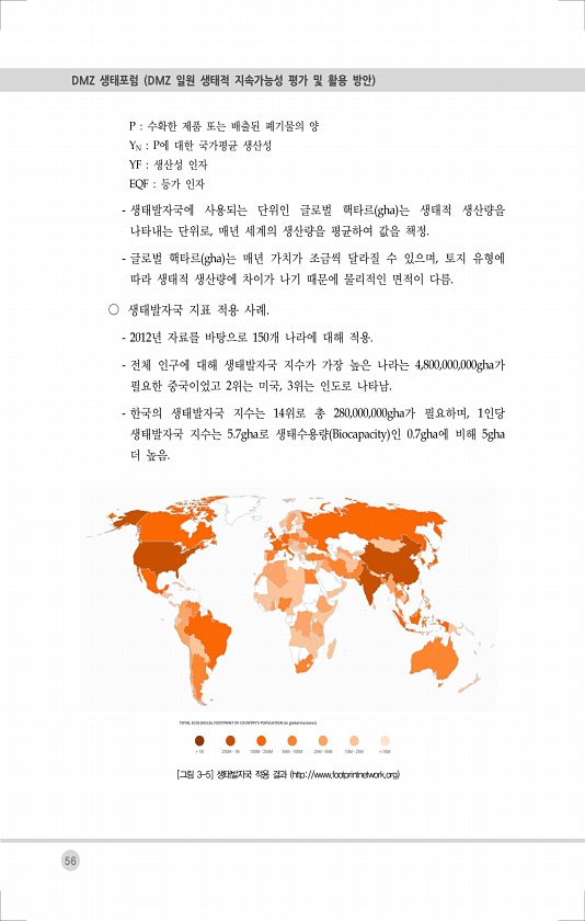 56 DMZ 생태포럼 DMZ 일원 생태적 지속가능성 평가 및 활용 방안 P 수확한 제품 또는 배출된 폐기물의 양 YN P에 대한 국가평균 생산성 YF 생산성 인자 EQF 등가 인자 생태발자국에 사용되는 단위인 글로벌 핵타르 gha 는 생태적 생산량을 나타내는 단위로, 매년 세계의 생산량을 평균하여 값을 책정. 글로벌 핵타르 gha 는 매년 가치가 조금씩 달라질 수 있으며, 토지 유형에 따라 생태적 생산량에 차이가 나기 때문에 물리적인 면적이 다름. ○ 생태발자국 지표 적용 사례. 2012년 자료를 바탕으로 150개 나라에 대해 적용. 전체 인구에 대해 생태발자국 지수가 가장 높은 나라는 4,800,000,000gha가 필요한 중국이었고 2위는 미국, 3위는 인도로 나타남. 한국의 생태발자국 지수는 14위로 ...