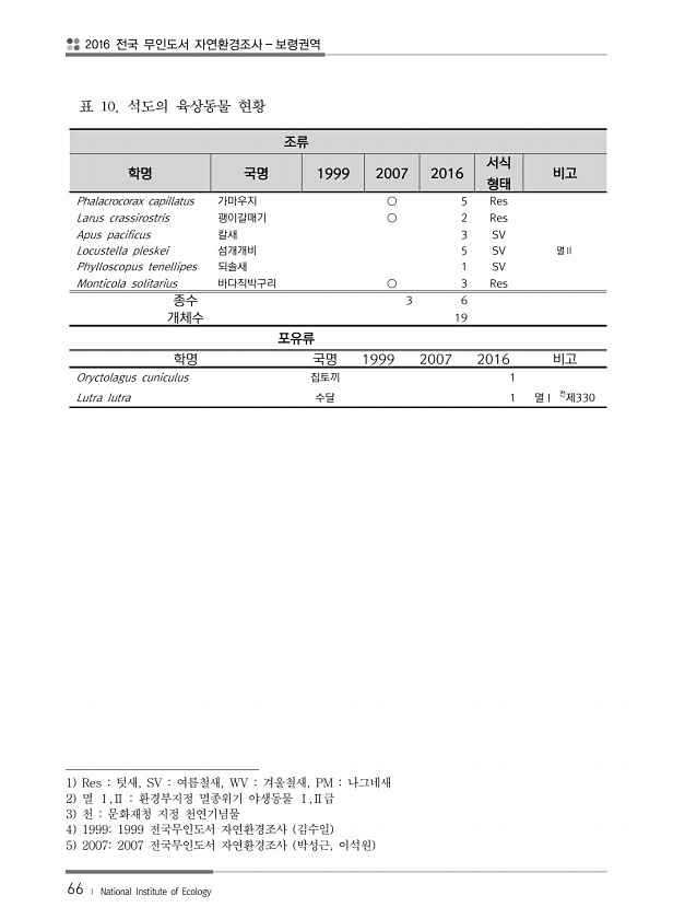 2016 전국 무인도서 자연환경조사 보령권역 66 ? National Institute of Ecology 표 10. 석도의 육상동물 현황 조류 학명 국명 1999 2007 2016 서식 형태 비고 Phalacrocorax capillatus 가마우지 ○ 5 Res Larus crassirostris 괭이갈매기 ○ 2 Res Apus pacificus 칼새 3 SV Locustella pleskei 섬개개비 5 SV 멸Ⅱ Phylloscopus tenellipes 되솔새 1 SV Monticola solitarius 바다직박구리 ○ 3 Res 종수 3 6 개체수 19 3 포유류 학명 국명 1999 2007 2016 비고 Oryctolagus cuniculus 집토끼 1 Lutra lutra 수달 1 멸Ⅰ 천...