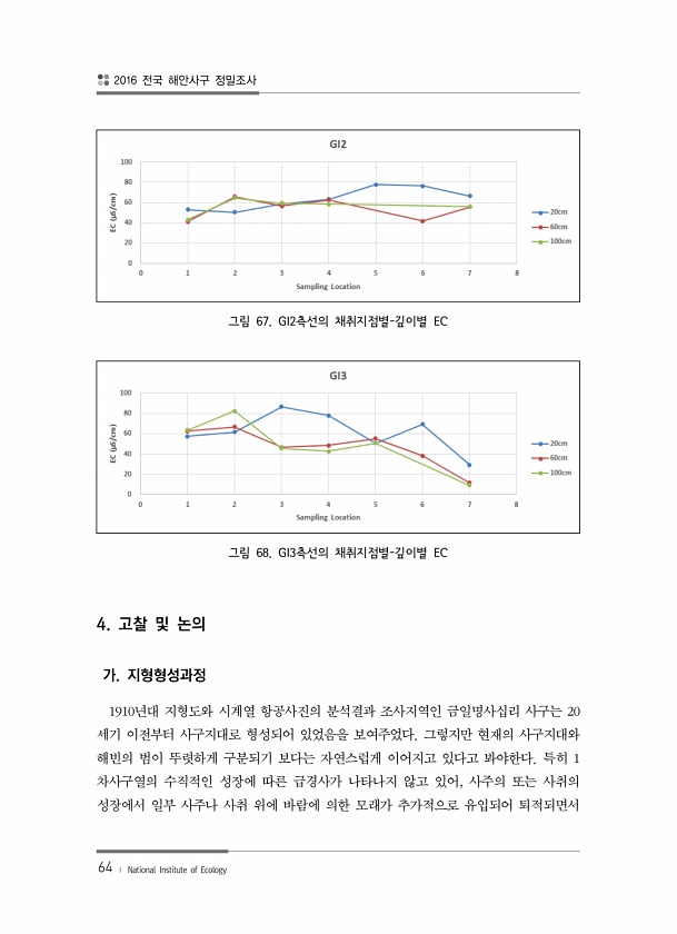 2016 전국 해안사구 정밀조사 64 ? National Institute of Ecology 그림 67. GI2측선의 채취지점별-깊이별 EC 그림 68. GI3측선의 채취지점별-깊이별 EC 4. 고찰 및 논의 가. 지형형성과정 1910년대 지형도와 시계열 항공사진의 분석결과 조사지역인 금일명사십리 사구는 20 세기 이전부터 사구지대로 형성되어 있었음을 보여주었다. 그렇지만 현재의 사구지대와 해빈의 범이 뚜렷하게 구분되기 보다는 자연스럽게 이어지고 있다고 봐야한다. 특히 1 차사구열의 수직적인 성장에 따른 급경사가 나타나지 않고 있어, 사주의 또는 사취의 성장에서 일부 사주나 사취 위에 바람에 의한 모래가 추가적으로 유입되어퇴적되면서