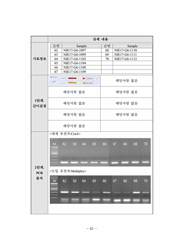 62 상세 내용 시료정보 순번 Sample 순번 Sample 62 NIE17-G6-1097 68 NIE17-G6-1110 63 NIE17-G6-1099 69 NIE17-G6-1111 64 NIE17-G6-1102 70 NIE17-G6-1112 65 NIE17-G6-1104 66 NIE17-G6-1108 67 NIE17-G6-1109 1단계. 간이검정 해당사항 없음 해당사항 없음 해당사항 없음 해당사항 없음 해당사항 없음 해당사항 없음 해당사항 없음 해당사항 없음 2단계. PCR 분석 내재 유전자-CruA 도입 유전자-Multiplex
