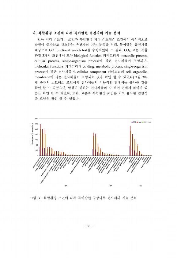 60 나. 복합환경 조건에 따른 특이발현 유전자의 기능 분석 단독 처리 스트레스 조건과 복합환경 처리 스트레스 조건에서 특이적으로 발현이 증가하고 감소하는 유전자의 기능 분석을 위해, 특이발현 유전자를 대상으로 GO functional enrich test를 수행하였다. 그 결과, CO2, 고온, 복합 환경 3가지 조건에서 모두 biological function 카테고리의 metabolic process, cellular process, single-organism process에 많은 전사체들이 포함되며, molecular functions 카테고리의 binding, metabolic process, single-organism process에 많은 전사체들이, cellular component 카테고리...
