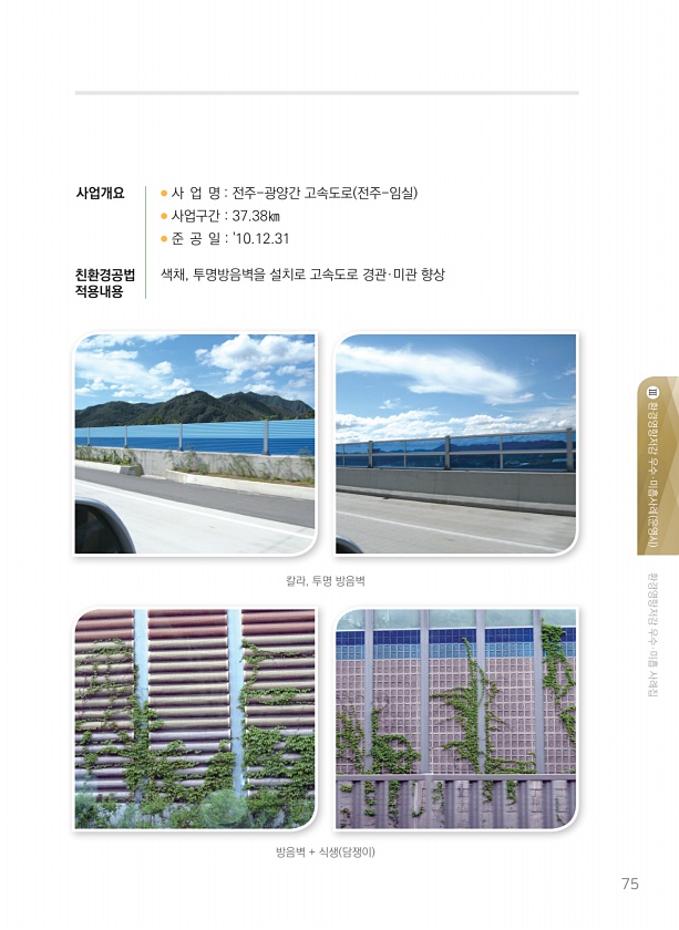 환경영향저감 우수·미흡 사례집 환경영향저감 우수·미흡사례 운영시 Ⅲ 75 칼라, 투명 방음벽 방음벽 + 식생 담쟁이 사업개요 ● 사 업 명 전주-광양간 고속도로 전주-임실 ● 사업구간 37.38㎞ ● 준 공 일 10.12.31 친환경공법 색채, 투명방음벽을 설치로 고속도로 경관·미관 향상적용내용