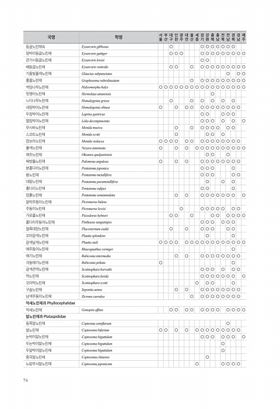 74 둥글노린재속 Eysarcoris gibbosus ○ ○ ○ ○ ○ ○ ○ ○ 점박이둥글노린재 Eysarcoris guttiger ○ ○ ○ ○ ○ ○ ○ ○ ○ ○ ○ ○ 큰가시둥글노린재 Eysarcoris lewisi ○ ○ 배둥글노린재 Eysarcoris ventralis ○ ○ ○ ○ ○ ○ ○ ○ ○ ○ ○ ○ 기름빛풀색노린재 Glaucias subpunctatus ○ ○ ○ 홍줄노린재 Graphosoma rubrolineatum ○ ○ ○ ○ ○ ○ ○ ○ ○ ○ 썩덩나무노린재 Halyomorpha halys ○ ○ ○ ○ ○ ○ ○ ○ ○ ○ ○ ○ ○ ○ ○ ○ ○ 멋쟁이노린재 Hermolaus amurensis ○ 느티나무노린재 Homalogonia grisea ○ ○ ○ ○ ○ ○ 네점...