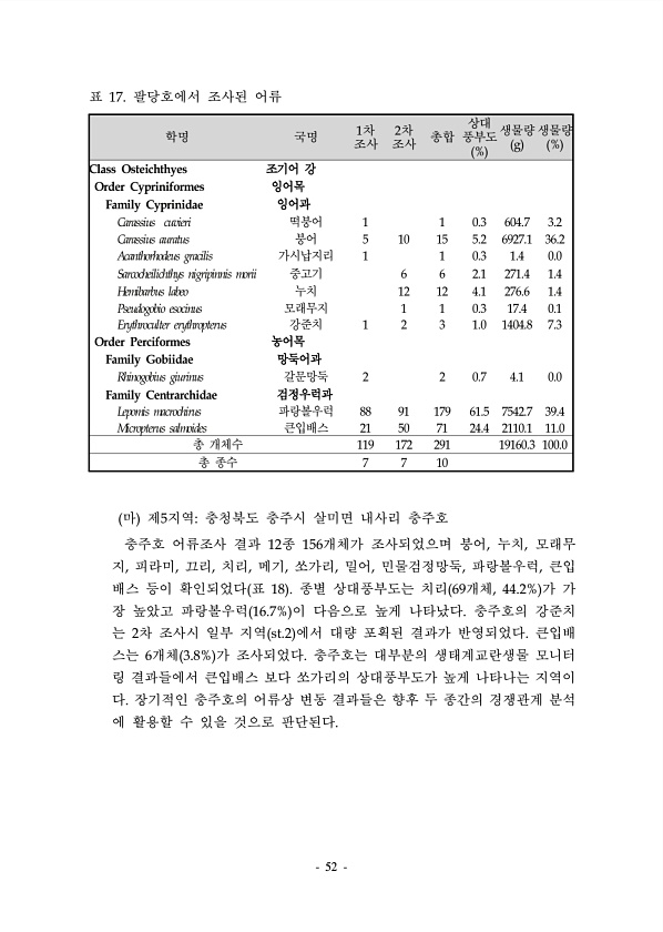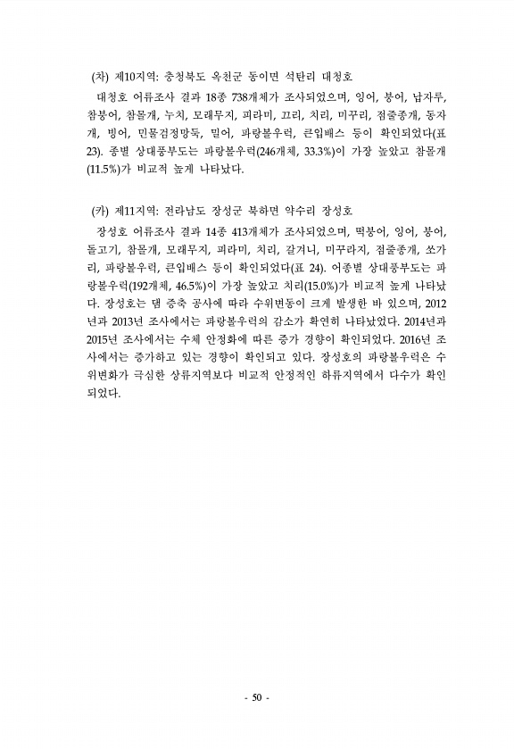 50 차 제10지역충청북도 옥천군 동이면 석탄리 대청호 대청호 어류조사 결과 18종 738개체가 조사되었으며, 잉어, 붕어, 납자루, 참붕어, 참몰개, 누치, 모래무지, 피라미, 끄리, 치리, 미꾸리, 점줄종개, 동자 개, 빙어, 민물검정망둑, 밀어, 파랑볼우럭, 큰입배스 등이 확인되었다 표 23 종별 상대풍부도는 파랑볼우럭 246개체, 33.3% 이 가장 높았고 참몰개 11.5% 가 비교적 높게 나타났다. 카 제11지역전라남도 장성군 북하면 약수리 장성호 장성호 어류조사 결과 14종 413개체가 조사되었으며, 떡붕어, 잉어, 붕어, 돌고기, 참몰개, 모래무지, 피라미, 치리, 갈겨니, 미꾸라지, 점줄종개, 쏘가 리, 파랑볼우럭, 큰입배스 등이 확인되었다 표 24 어종별 상대풍부도는 파 랑볼우럭 192개체,...