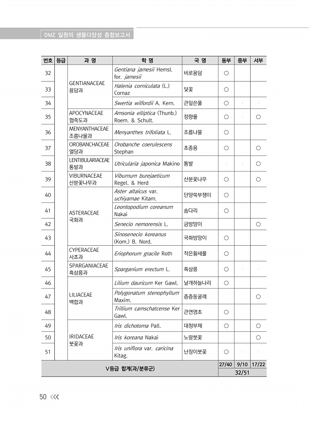 DMZ 일원의 생물다양성 종합보고서 50 번호 등급 과 명 학 명 국 명 동부 중부 서부 32 GENTIANACEAE 용담과 Gentiana jamesii Hemsl. for. jamesii 비로용담 ○ 33 Halenia corniculata L. Cornaz 닻꽃 ○ 34 Swertia wilfordii A. Kern. 큰잎쓴풀 ○ 35 APOCYNACEAE 협죽도과 Amsonia elliptica Thunb. Roem. & Schult. 정향풀 ○ ○ 36 MENYANTHACEAE 조름나물과 Menyanthes trifoliata L. 조름나물 ○ 37 OROBANCHACEAE 열당과 Orobanche coerulescens Stephan 초종용 ○ ○ 38 LENTIBULARIACEAE ...