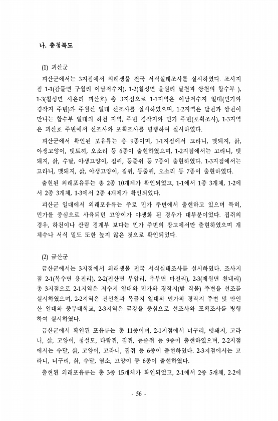 56 나. 충청북도 1 괴산군 괴산군에서는 3지점에서 외래생물 전국 서식실태조사를 실시하였다. 조사지 점 1-1 감물면 구월리 이담저수지 , 1-2 칠성면 율원리 달천과 쌍천의 합수부 , 1-3 칠성면 사은리 괴산호 총 3지점으로 1-1지역은 이담저수지 일대 민가와 경작지 주변 와 주월산 일대 선조사를 실시하였으며, 1-2지역은 달천과 쌍천이 만나는 합수부 일대의 하천 지역, 주변 경작지와 민가 주변 포획조사 , 1-3지역 은 괴산호 주변에서 선조사와 포획조사를 병행하여 실시하였다. 괴산군에서 확인된 포유류는 총 9종이며, 1-1지점에서 고라니, 멧돼지, 삵, 야생고양이, 멧토끼, 오소리 등 6종이 출현하였으며, 1-2지점에서는 고라니, 멧 돼지, 삵, 수달, 야생고양이, 집쥐, 등줄쥐 등 7종이 출현하였다...