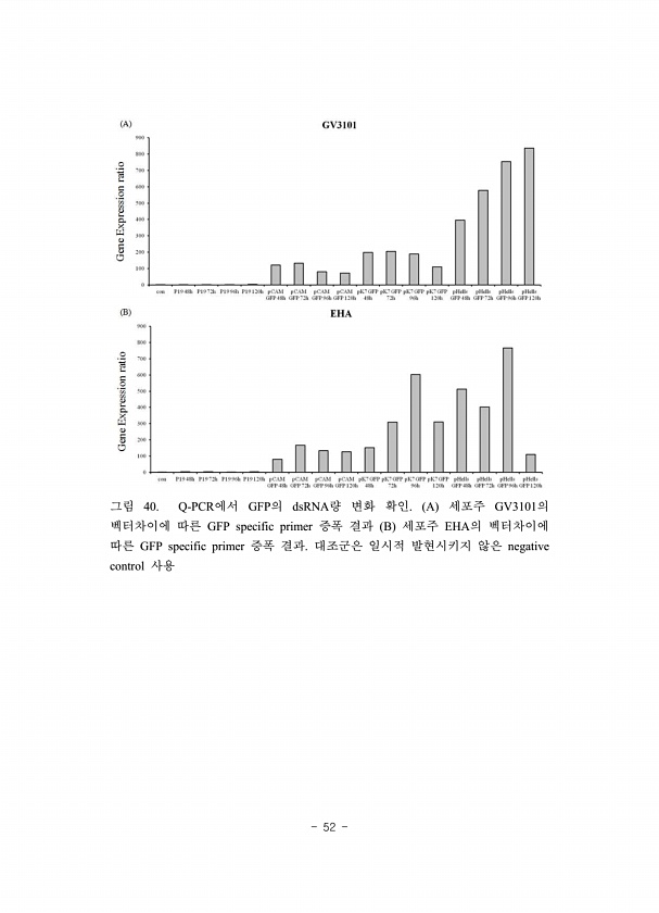 52 그림 40. Q-PCR에서 GFP의 dsRNA량 변화 확인. A 세포주 GV3101의 벡터차이에 따른 GFP specific primer 증폭 결과 B 세포주 EHA의 벡터차이에 따른 GFP specific primer 증폭 결과. 대조군은 일시적 발현시키지 않은 negative control사용